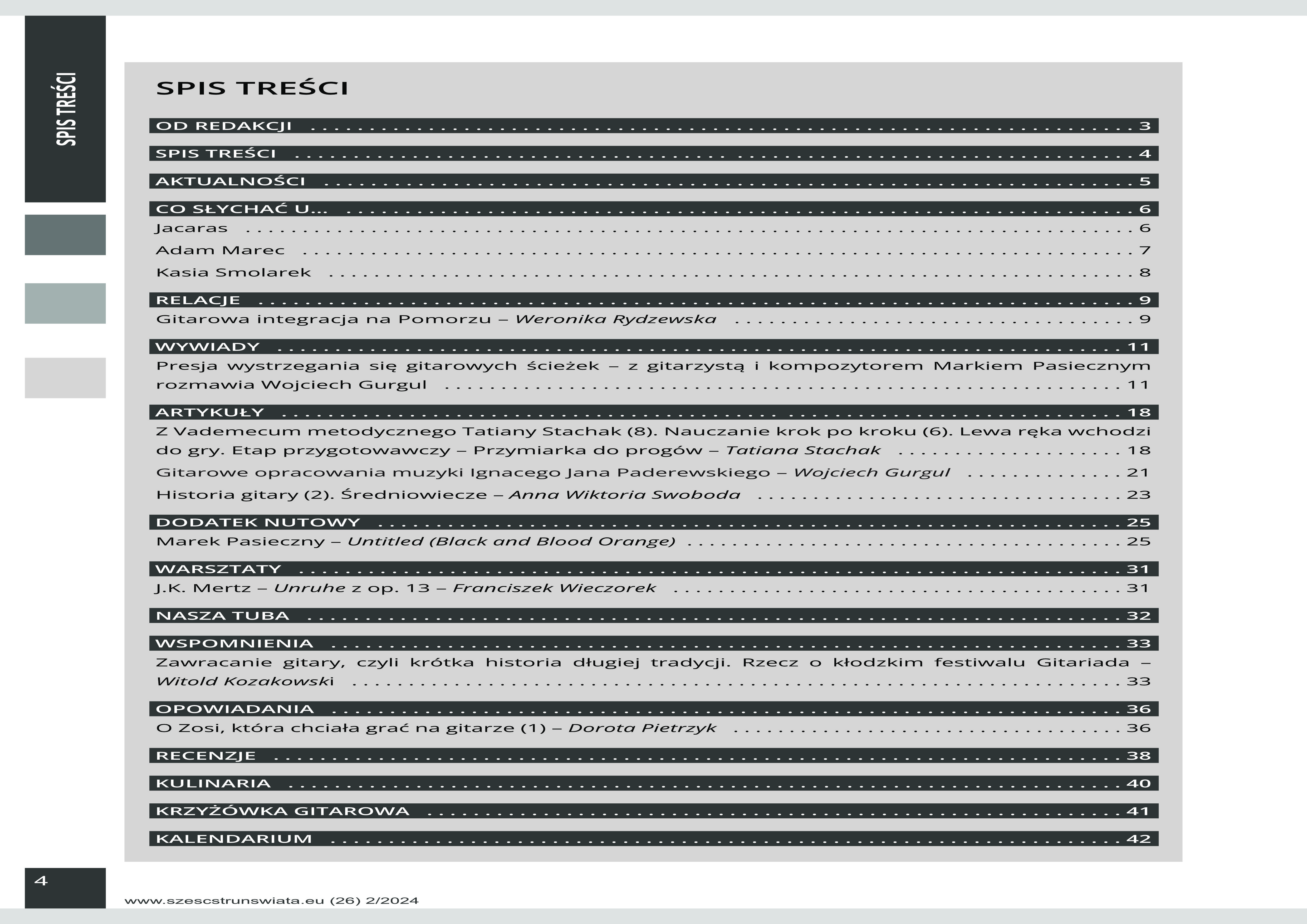 Magazyn (kwartalnik) gitarzystów klasycznych „Sześć Strun Świata” - wydawany od 2015 roku (z przerwą w latach 2018-2020) - poruszający zagadnienia muzyki gitarowej.