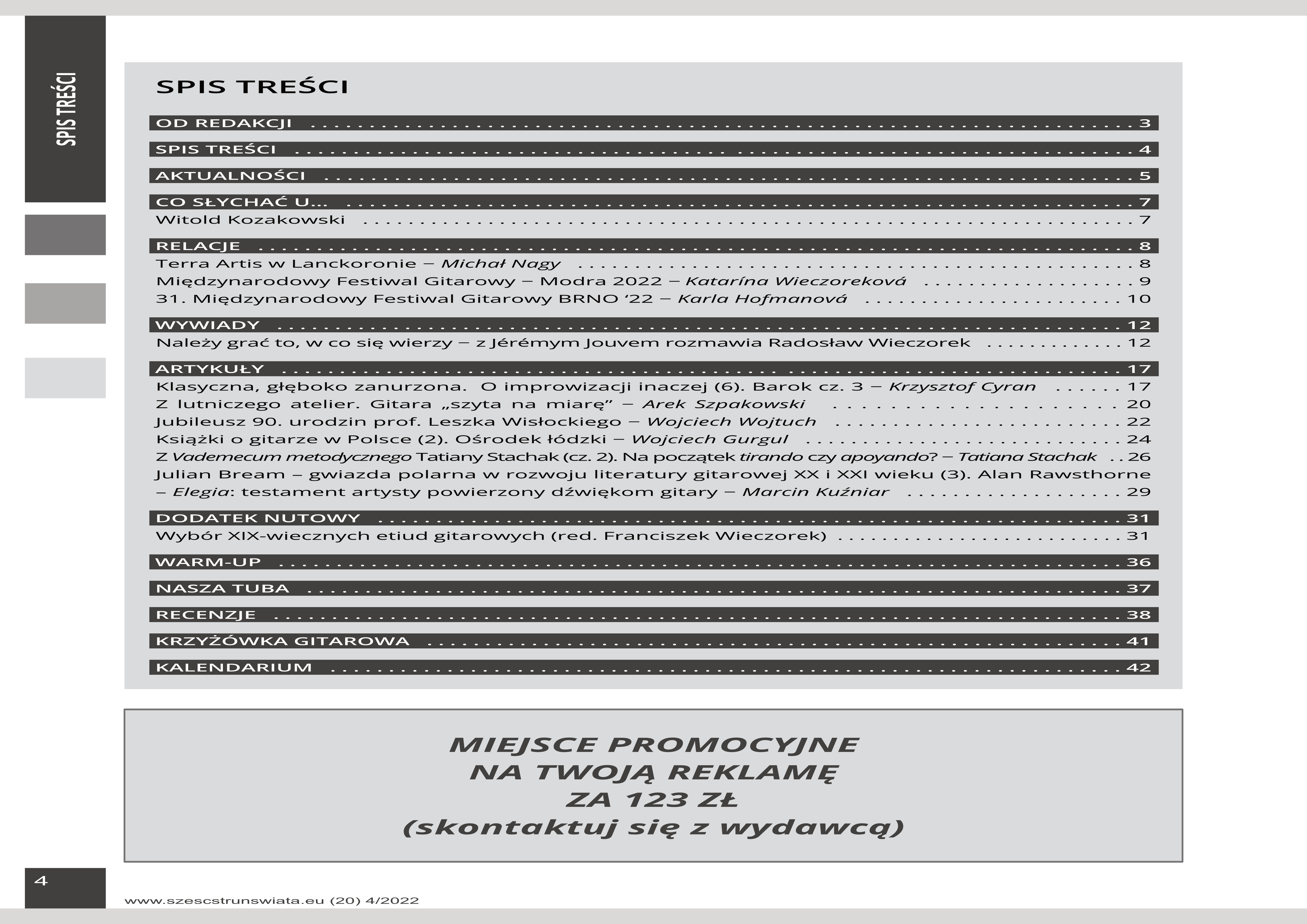 Magazyn (kwartalnik) gitarzystów klasycznych „Sześć Strun Świata” - wydawany od 2015 roku (z przerwą w latach 2018-2020) - poruszający zagadnienia muzyki gitarowej.