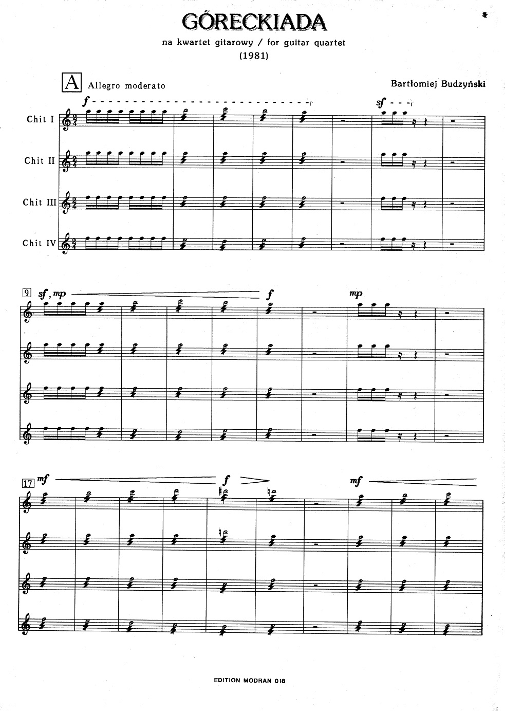Kolejny zeszyt z autorskiej serii Bartłomieja Budzyńskiego zawierający popularną jego kompozycję Góreckiada. Pozycja ta - oprócz partytury - zawiera partie poszczególnych głosów oraz dodatek dla wersji na osiem gitar. 16 stron plus 16 stron "głosów".